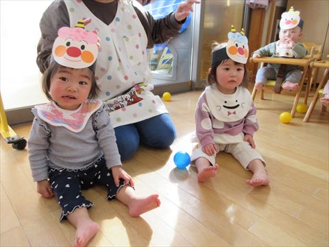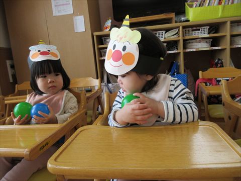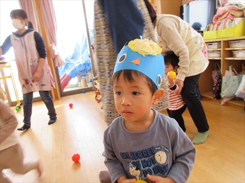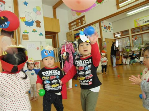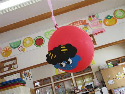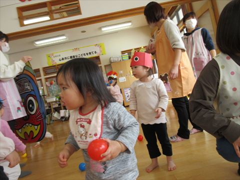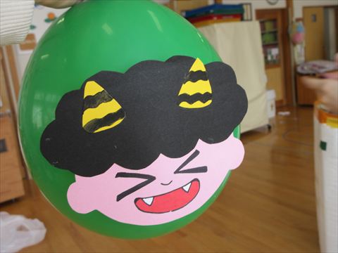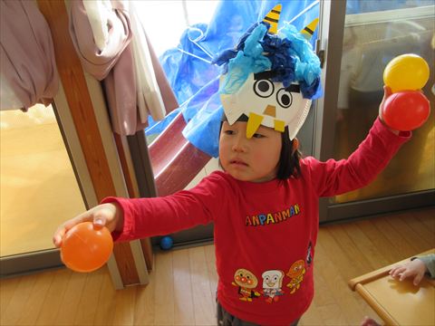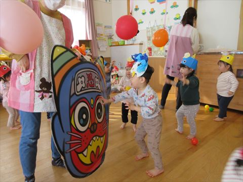 鬼の顔を付けた風船と大型の鬼が登場して、カラーボールを豆に見立てて