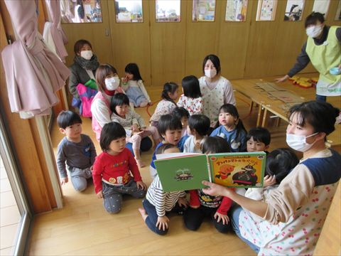 ぱんだ組さん、お集りをして絵本を読んでもらっています。