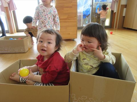子ども達にとっては段ボール箱も玩具の一つです。💓