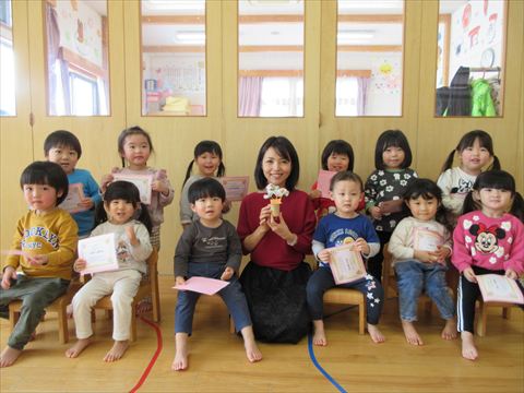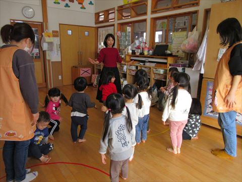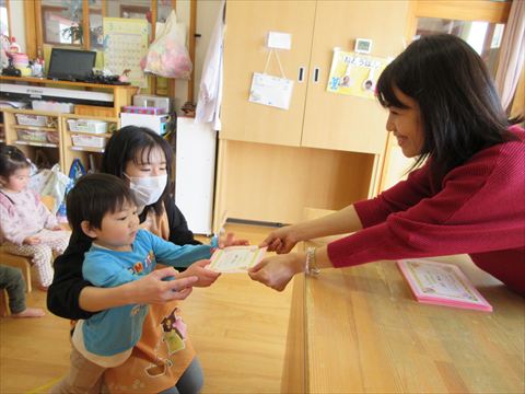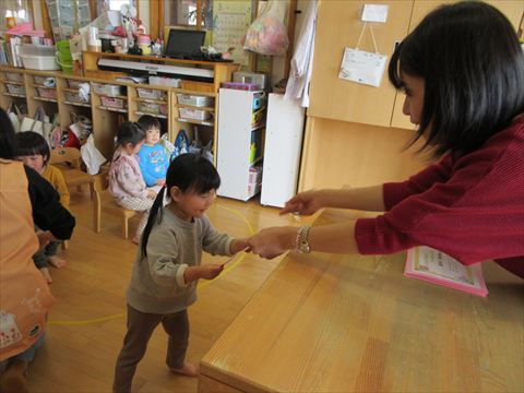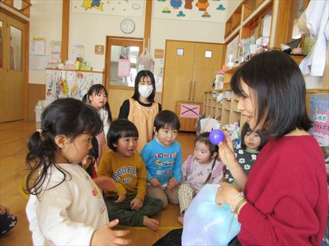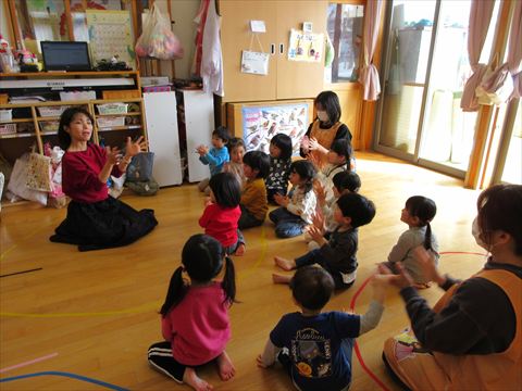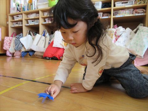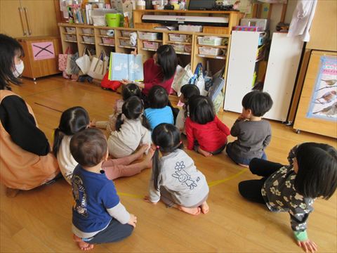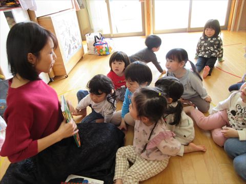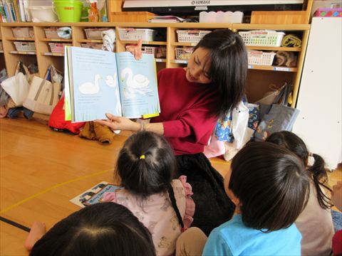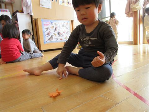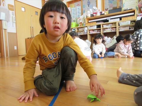 英語の絵本を読んでもらったり、折り紙の蛙をお土産でもらったり