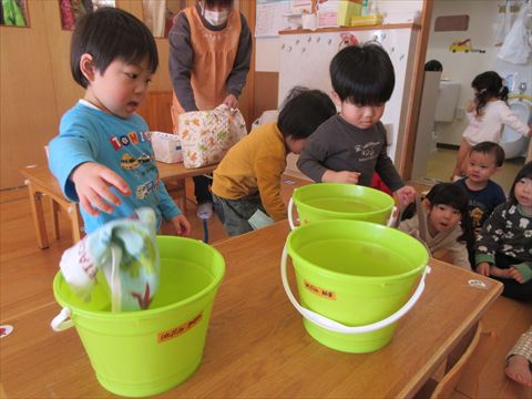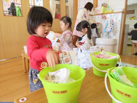 ぱんだ組さん、朝のお仕度を自分でしています。