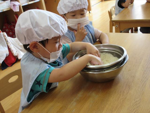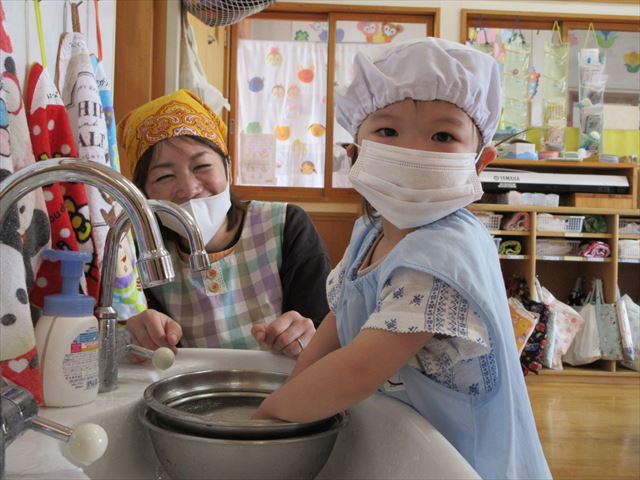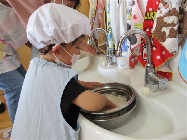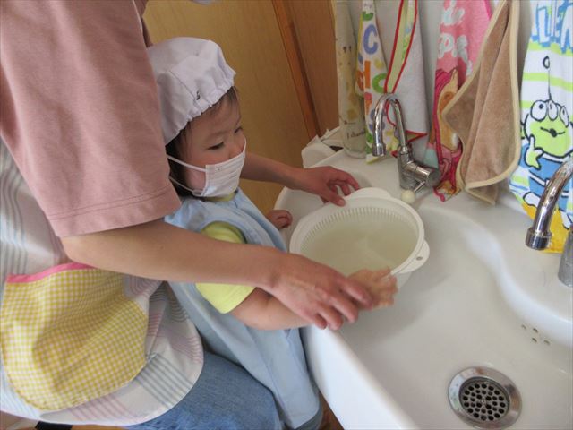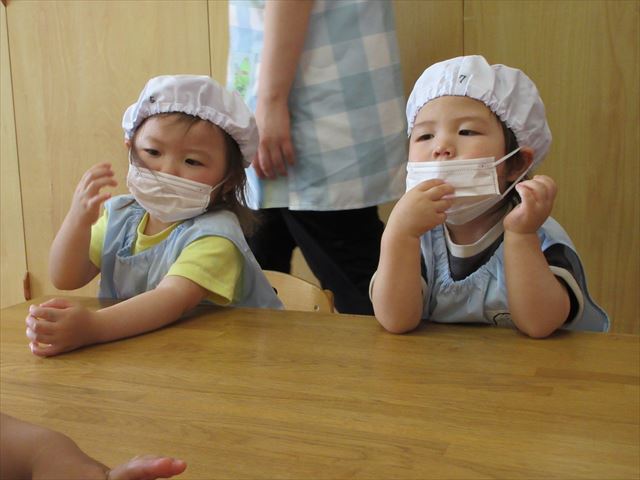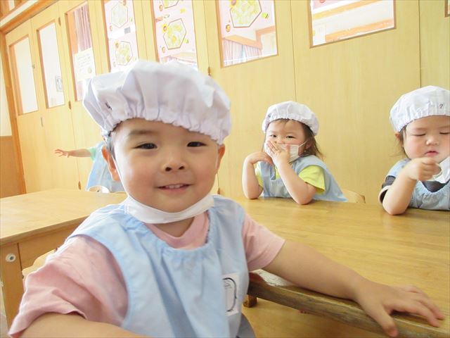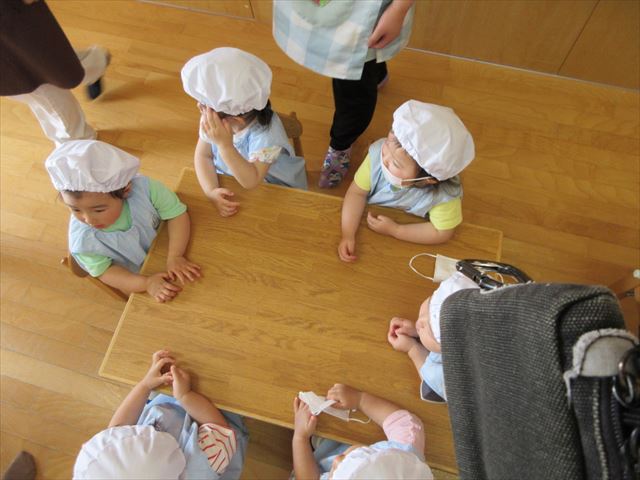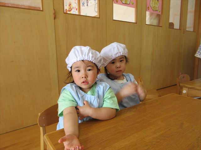 帽子、エプロン、マスクをして腕まくりをしてがんばるぞ~!!