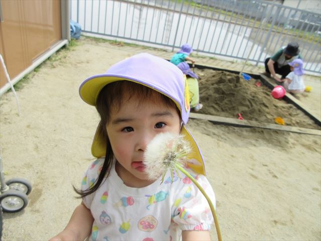 「ほら、見て!たんぽぽの綿毛だよ。」