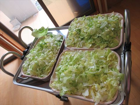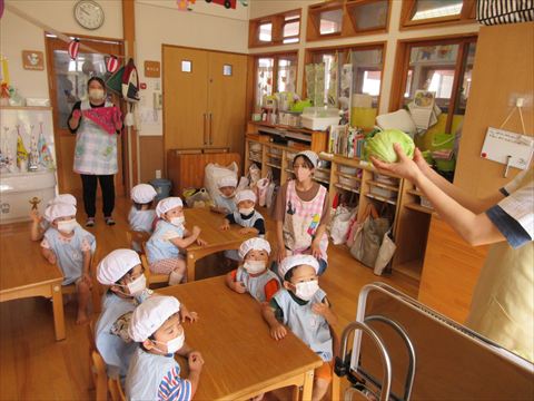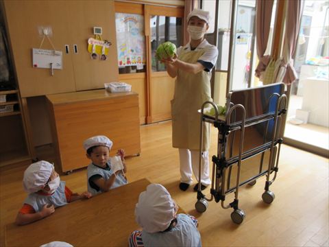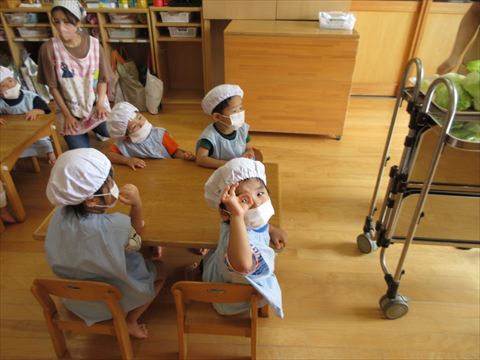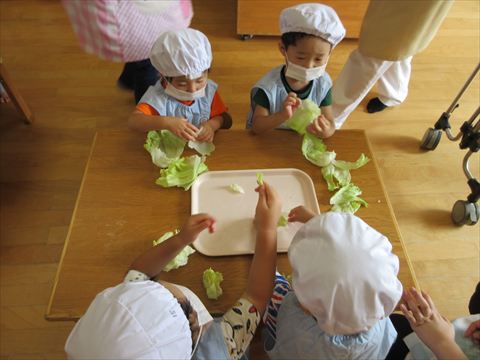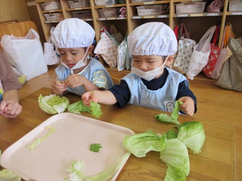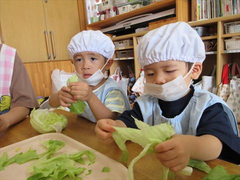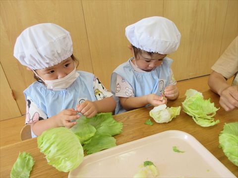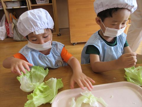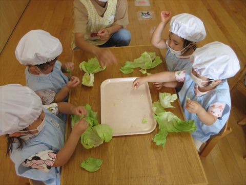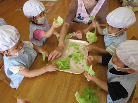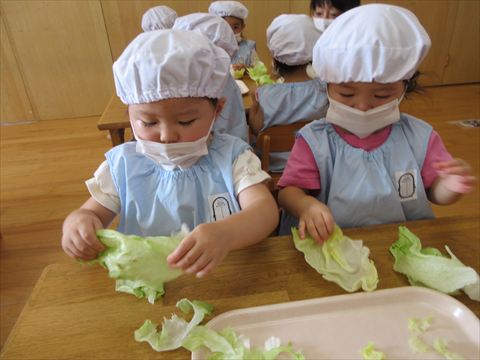 ぱんだ組さん、今日の食育活動はレタスちぎりです。