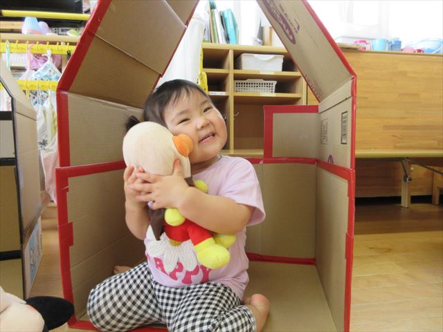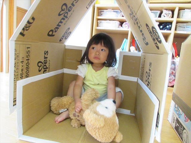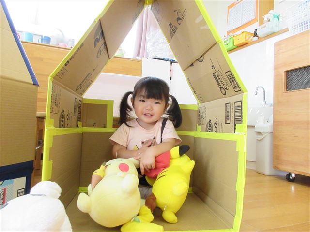 手作りの段ボールハウスと手作りおもちゃがいっぱい✨