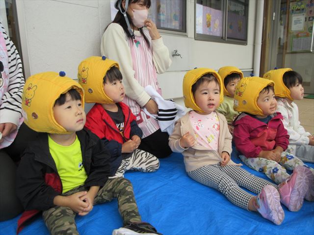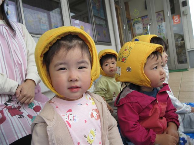 防災頭巾をかぶって、