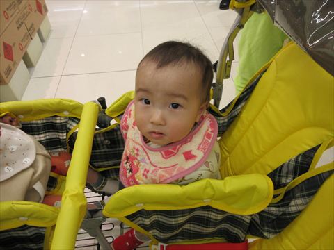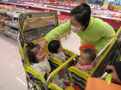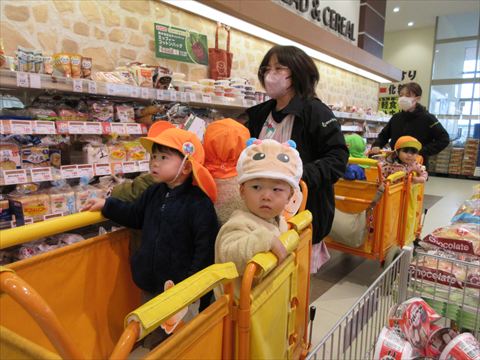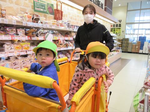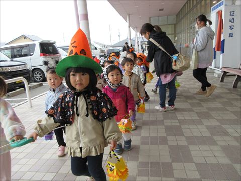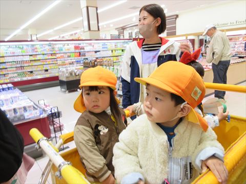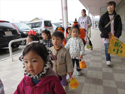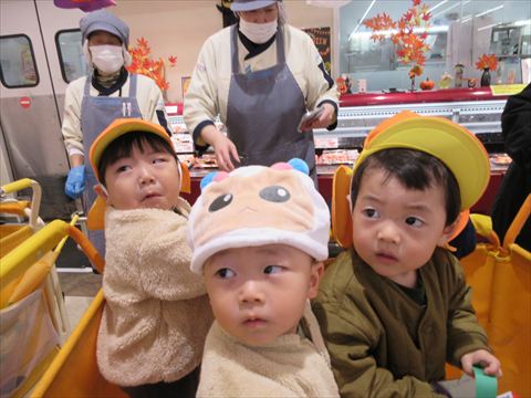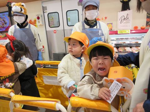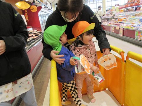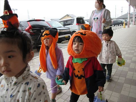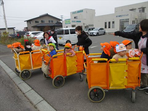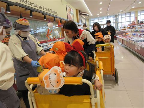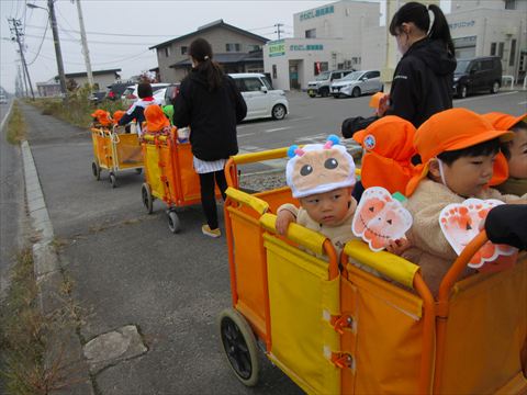 遠目で見れば、子ども達が乗っている散歩車がカボチャの馬車に見えませんか?