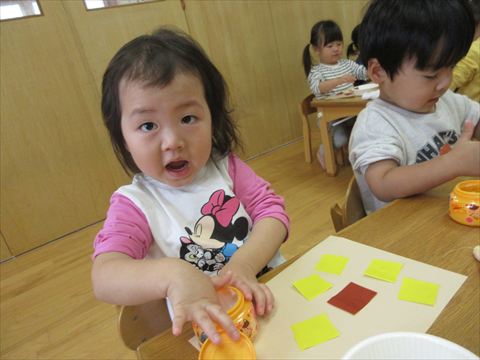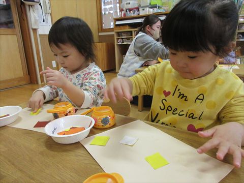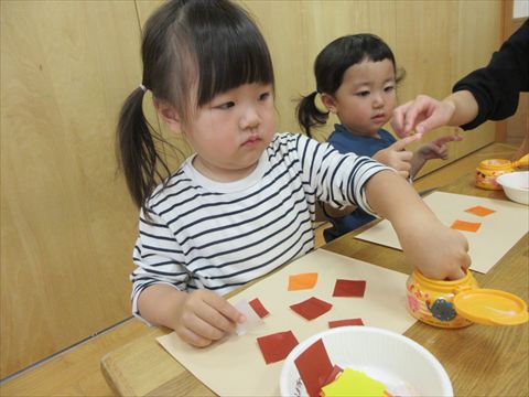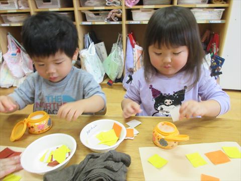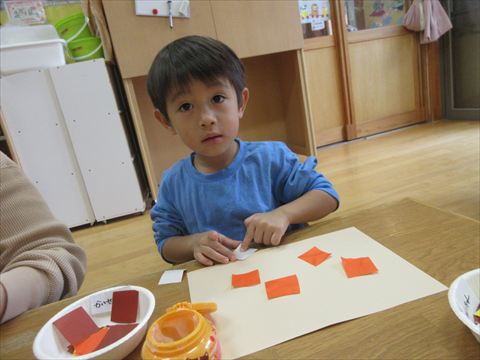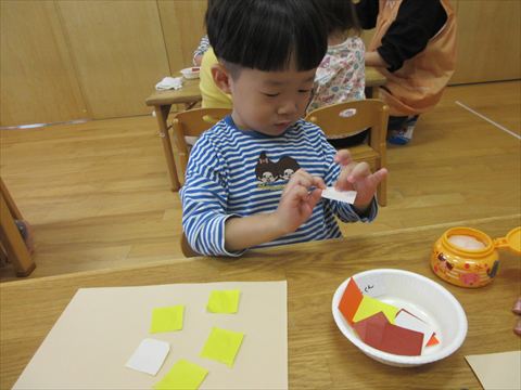 ぱんだ組さん、糊で折り紙を台紙に貼っています。