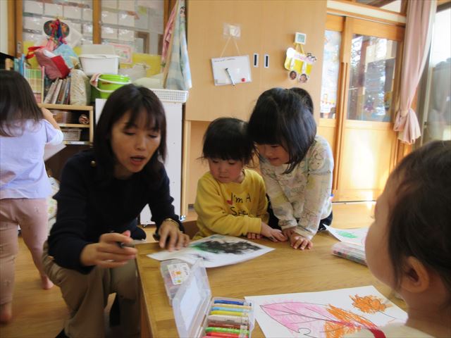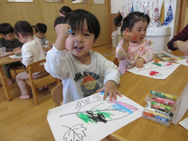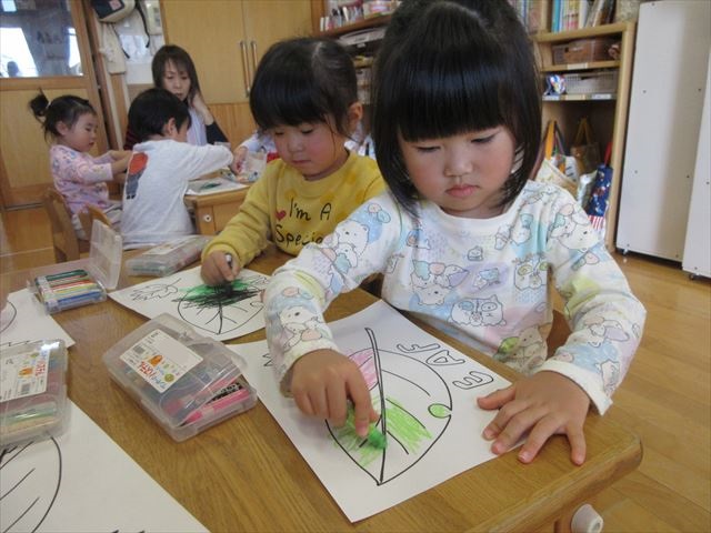 葉っぱの絵を好きな色で塗っています♪