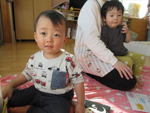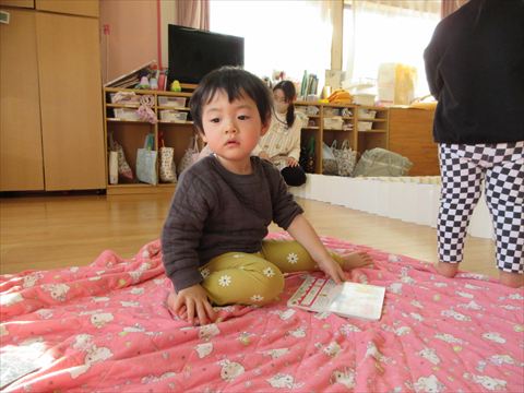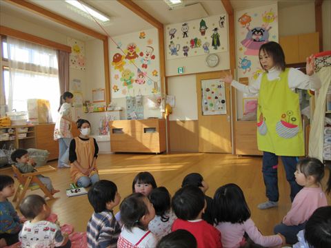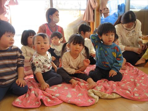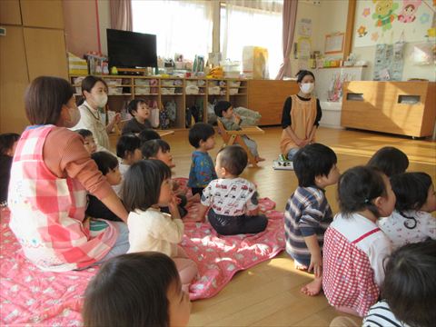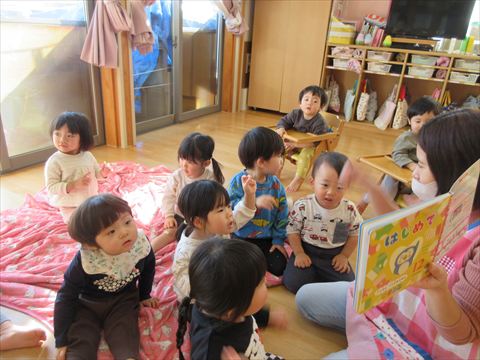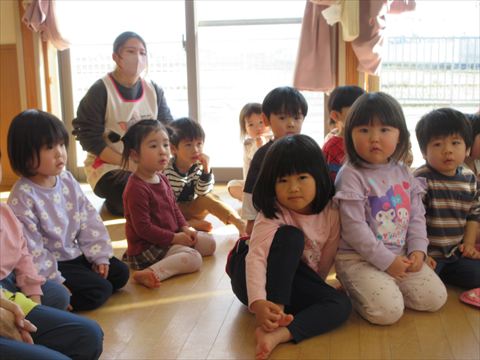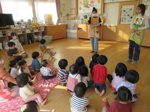避難訓練の後、うさぎ組さんは絵本を読んでもらいました。