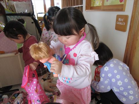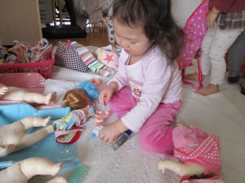 女の子は、ママの姿を見ているせいかお人形のお世話がとても上手です。