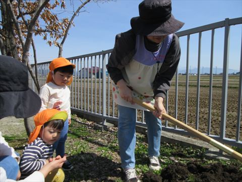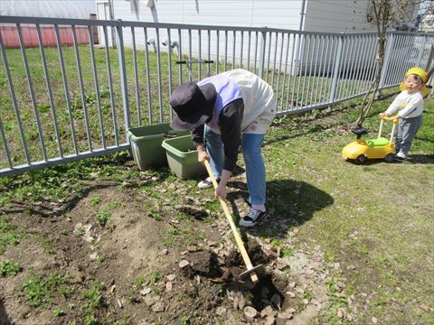 ぱんだ組さんの先生が鍬を持ち、何かを始めようとしていますよ・・・